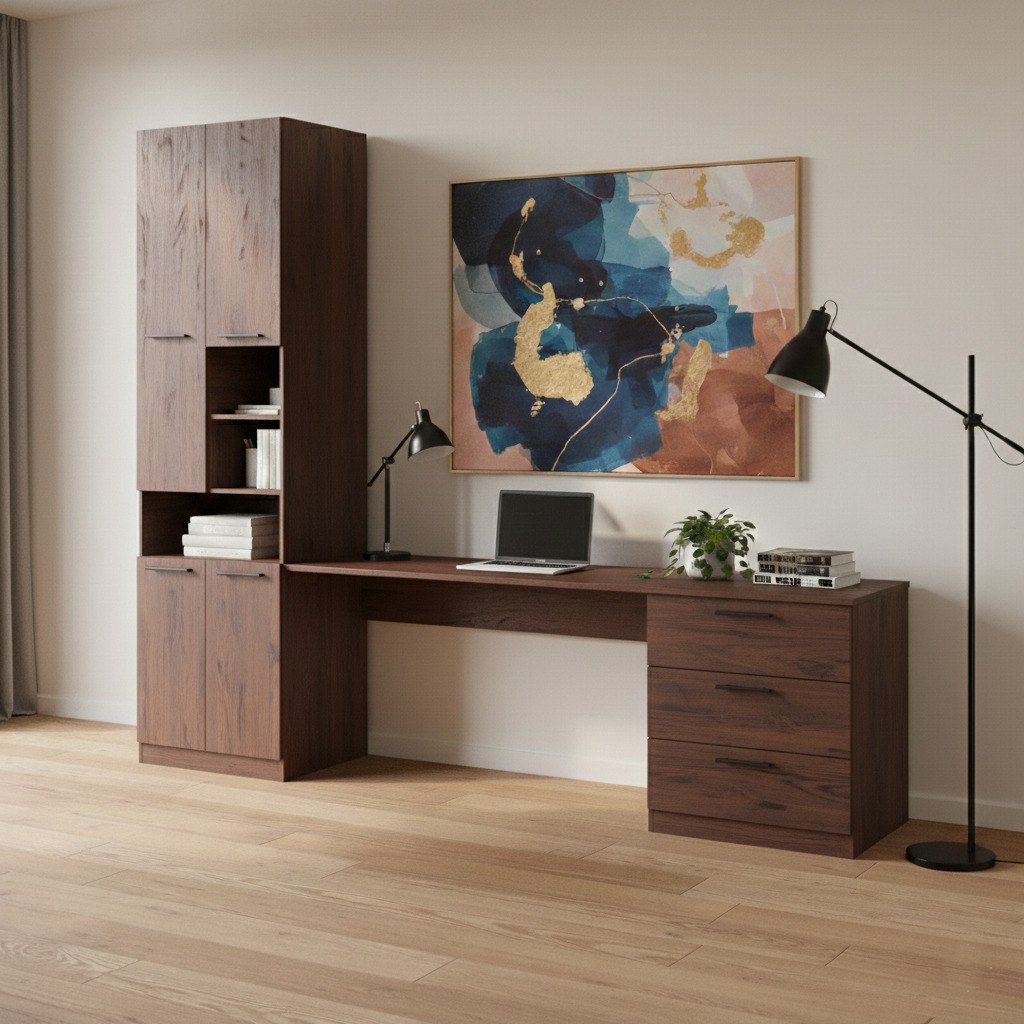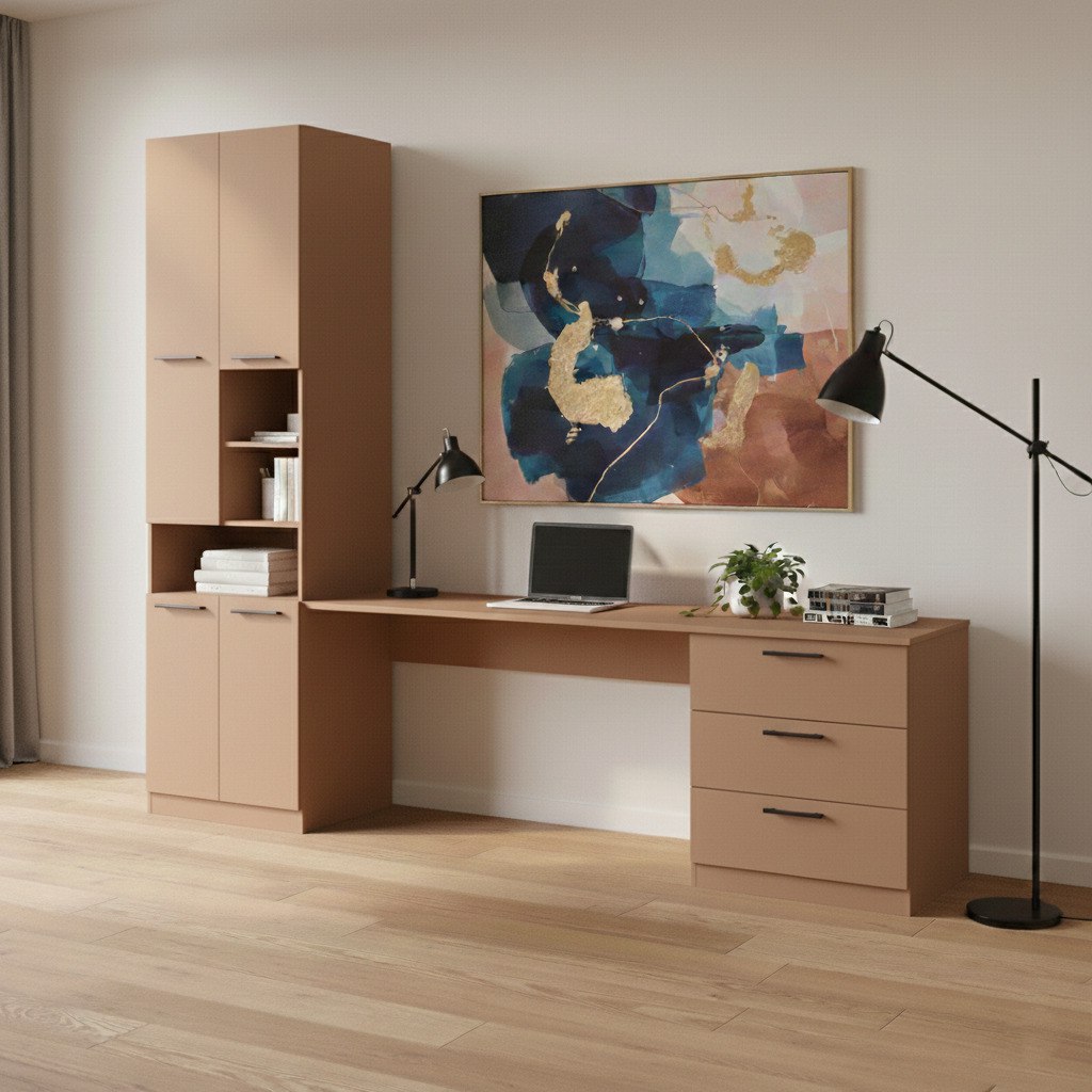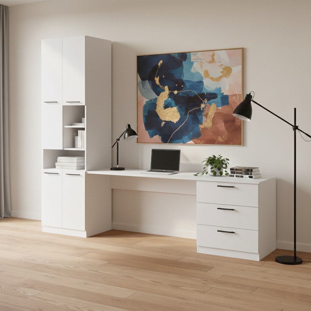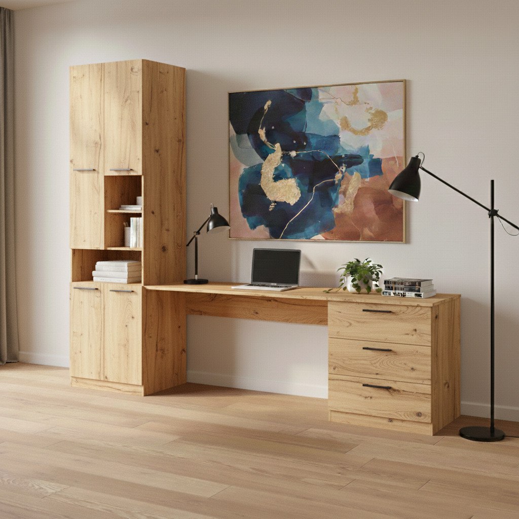 Особливістю цього столу є шафа. Таке рішення дозволяє легко діставати книги, папки та офісне приладдя, не встаючи з крісла. Сама шафа обладнана різними типами зберігання: відкриті полиці чудово підходять для улюблених книг, органайзерів чи декоративних елементів, а закриті шафки дозволяють сховати від сторонніх очей документи або особисті речі. Поєднання цих елементів робить цей **стіл з шафою** незамінним помічником у підтриманні порядку та створенні ергономічного робочого місця. 💻✨