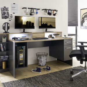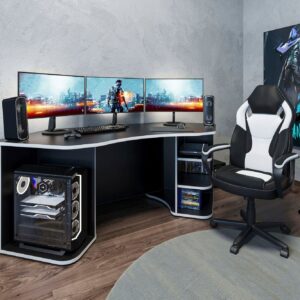 * Продумайте, в том числе и на перспективу, какая техника, оборудование, периферийные устройства и другие гаджеты будут располагаться на вашем «игровом поле». Если их предполагается достаточное количество, то в таком случае стоит купить геймерский стол с дополнительными «надстройками» в виде этажерок, консолей, полочек и т.д. Которые помогут сделать так, чтобы все было на своих местах и не мешало вам. В данном случае, оптимальным решением будет угловой компьютерный стол, обладающий большой площадью полезной поверхности, повышенной эргономичностью, и при этом занимающий минимум места в комнате.